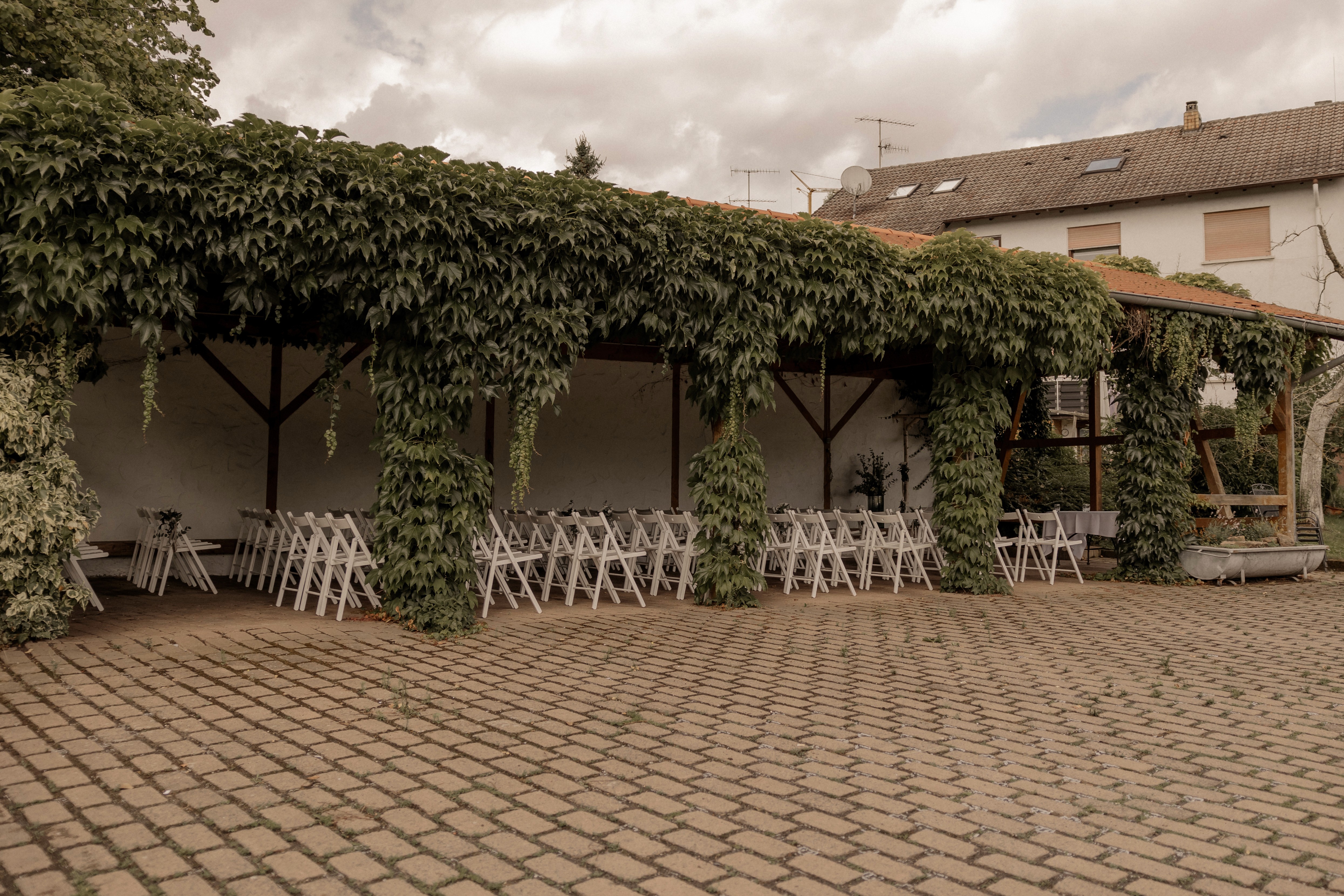 Der Außenbereich verbindet alles – die Gebäude, die Menschen und den Moment. Perfekt für Sektempfang, Kaffeetafel oder lockeres Beisammensein unter freiem Himmel. Umgeben von alten Mauern, warmem Stein und blühendem Grün entsteht hier sofort Hofgut-Gefühl.